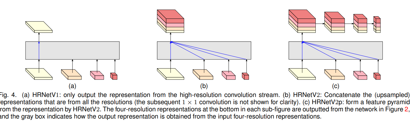 (5) 4개 해상도 과정이 병렬적으로 진행됐다면 Representation Head로 출력한다. 출력방법에 따라 Representation Head는 HRNetV1, HRNetV2, HRNetV2p로 구분된다.