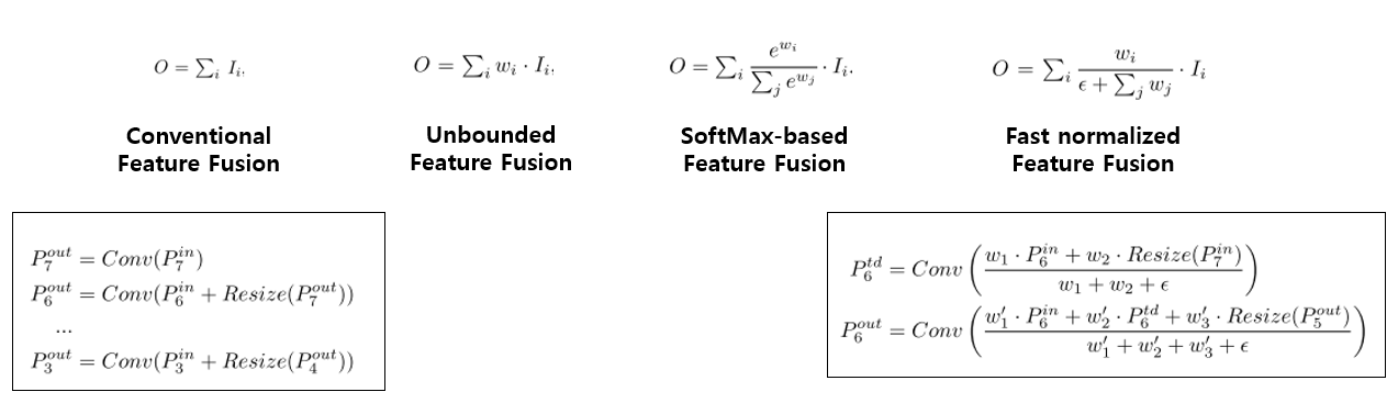 이를 보완코자 0.0001크기의 입실론을 설정해 분모에 더해줬다. 그 결과 Fast normalized Feature Fusion 식이 탄생했다.