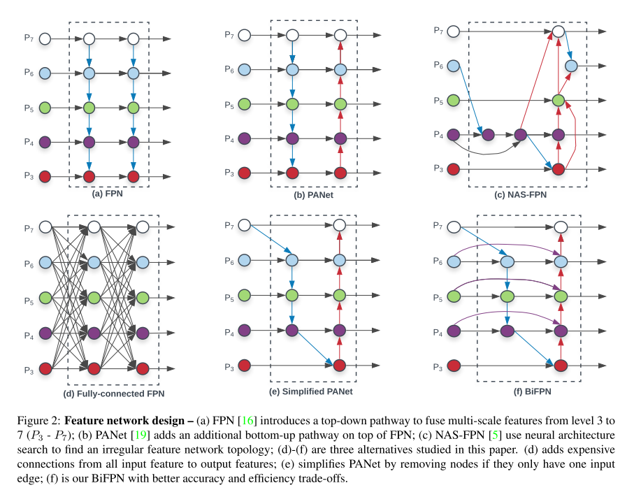 최종적으로 Simplified PANet에서 동일 단계 간 shortcut을 설정해 더 많은 feature를 fusion할 수 있게 한 Bi-FPN을 완성했다.