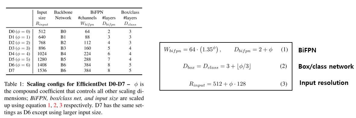 EfficientDet은 B0부터 B6를 사용했다. Compound scailing은 다음과 같은 표로 설정했다.